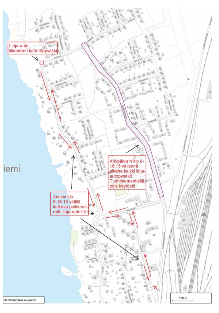 Ajankohtaista / 28.04.2026Tahiniemessä Poikkitien perusparannuksen johdosta linja-autoliikenteelle joudutaan tekemään poikkeusjärjestelyitä maanantaista 4.5.2026 alkaen. Arkipäivisin klo 8–16.15 välillä kulkevat linja-autot kääntyvät Kukkaroniementieltä Marjatielle ja ajavat sitä reittiä Reunakadun kautta Tahintielle. Linja-autot tekevät Tahintien pohjoispäädyssä olevalla linja-autopysäkillä käännöksen takaisin päin. Tahintien varrella ja Poikkitien länsipäässä olevat pysäkit toimivat korvaavina kaikille Tuohiniementien varrella oleville pysäkeille, jotka ovat edellä mainitulla aikavälillä pois käytöstä. Muina ajankohtina kaikki Tahiniemen pysäkit ovat normaalisti käytössä. Arvioitu kesto poikkeusjärjestelyille on 4.5.–12.6.2026. Mikäli aikataulusta ollaan edellä, niin palataan normaaleihin liikennejärjestelyihin tällöin heti.
