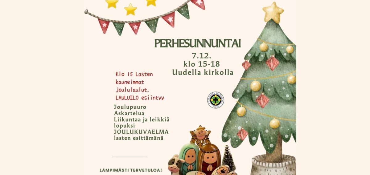 Jouluista perhesunnuntaita vietetään 7.12. Tapahtumapäivä alkaa Uudessa kirkossa klo 15 Lasten kauneimmat joululaulut yhteislauluilla. Tilaisuudessa esiintyy myös lapsikuoro Lauluilo.