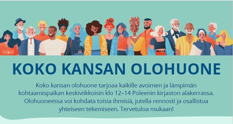 Koko kansan olohuone tarjoaa kaikille avoimen ja lämpimän kohtaamispaikan keskiviikkoisin klo 12–14 Poleenin kirjaston alakerrassa. Olohuoneessa voi kohdata toisia ihmisiä, jutella rennosti ja osallistua yhteiseen tekemiseen. Tervetuloa mukaan!