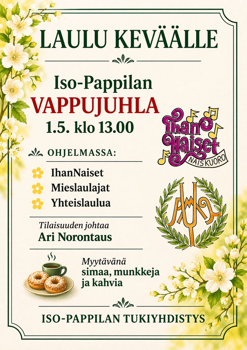 LAULU KEVÄÄLLE! Iso-Pappilan VAPPUJUHLA on perinteinen Pieksämäen Mieskuoron ja IhanNaisten yhteinen konsertti, missä yleisö pääsee mukaan laulamaan keväisiä lauluja.