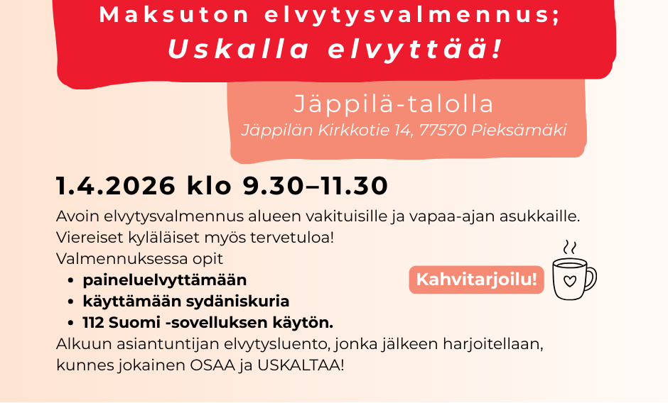 Maksuton elvytysvalmennus Pieksämäen Järjestötalolla, 2. krs 1.4.2026 klo 13.00-15.00.