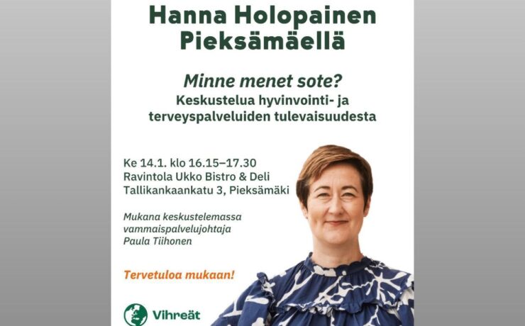 ke 14.01.2026 @ 16:15 - 17:30 - Avoin keskustelutilaisuus hyvinvointi- ja terveyspalveluiden tulevaisuudesta keskiviikkona 14.1.2026 klo 16.15–17.30 (UKKO Bistro ja Deli, Veturitallit). Mukana keskustelemassa kansanedustaja Hanna Holopainen (vihr.) ja Etelä-Savon hyvinvointialueen Eloisan vammaispalvelujohtaja Paula Tiihonen. Lue lisää