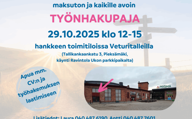 ke 29.10.2025 @ 12:00 - 15:00 - Tervetuloa Oma suunta -hankkeen kaikille avoimeen ja maksuttomaan TYÖNHAKUPAJAAN keskiviikkona 29.10.2025 klo 12-15 Veturitalleille. Sisäänkäynti Ravintola Ukon parkkipaikalta Veturitallien ulkokehältä, ei siis Veturitorilta. Voit saapua Sinulle sopivaan aikaan klo 12-15 välillä. Työnhakupajassa saat apua ja vinkkejä mm. CV:n ja työhakemuksen laatimiseen, työpaikkojen etsimiseen tai vaikkapa video-CV:n kuvaamiseen.... Lue lisää