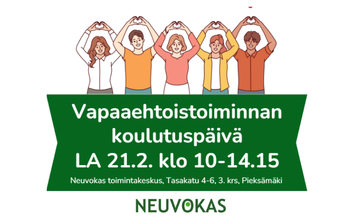 la 21.02.2026 @ 10:00 - 14:15 - Oletko kiinnostunut vapaaehtoistoiminnasta? Ilmaisessa koulutuksessa tutustut vapaaehtoistoiminnan perusteisiin ja saat valmiuksia kohdata muistisairaita ihmisiä. Koulutus sisältää liikunnallisen osion ja erilaisiin apuvälineisiin tutustumista. Koulutus on kaikille avoin eikä se sido sinua mihinkään. Koulutuspäivän ohjelma: klo 10:00 - 10:45 Vapaaehtoistoiminnan perusteet ja eettiset ohjeet, Neuvokas Toimintakeskus klo 11:00 -... Lue lisää
