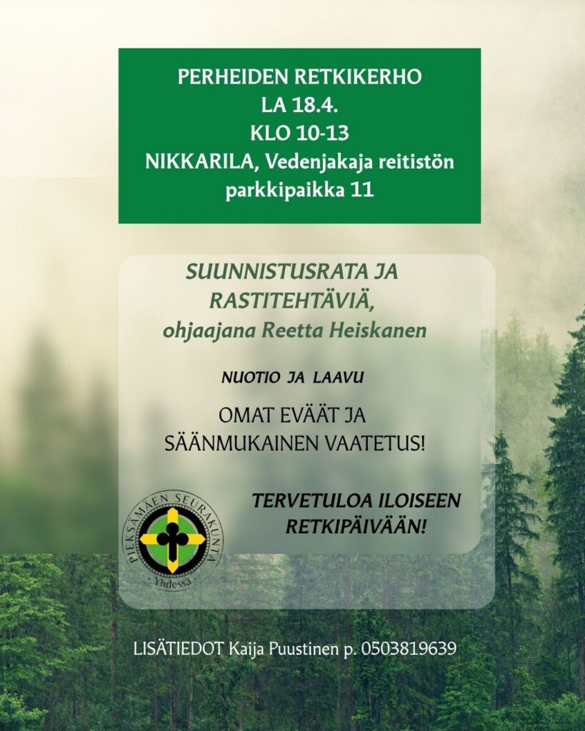 Ohjelmassa mm. Reetta Heiskasen tekemä suunnistusrata ja tehtävärasteja. Mukana myös Pieksämäen seurakunnan varhaiskasvatuksen työntekijöitä. Retkipaikalla on nuotio, laavu ja huussi.