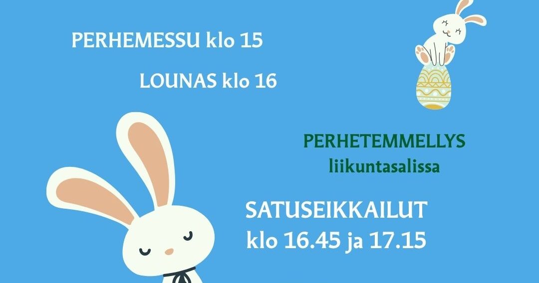 Ohjelma jatkuu n. klo 16 lounaalla sekä pääsiäisaskartelulla ja perhetemmellyksessä liikkuen ja touhuten.