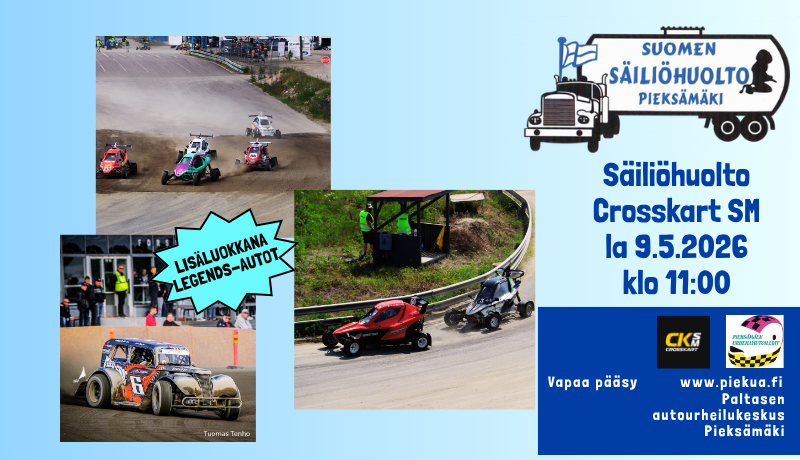 Sora saa kyytiä, kun Crosskart SM-sarjan osakilpailu ajetaan Pieksämäen Paltasella. Ajettavia luokkia on viisi kappaletta ja kuljettajien ikähaitari viisivuotiaasta ylöspäin. Lisäluokkana päivään vauhtia ja upeita autoja tuo Legendsit. Kilpailua pääsee seuraamaan penkalta ja varikolle voi tulla ihailemaan autoja. Kilpailuun on vapaa pääsy. Autourheilukeskuksessa kahvio ja grillit palvelevat koko päivän. Tarjolla grillimakkaraa, makkaraperunoita, kahvia ja virvoitusjuomia, sekä muuta suolaista ja makeaa purtavaa.