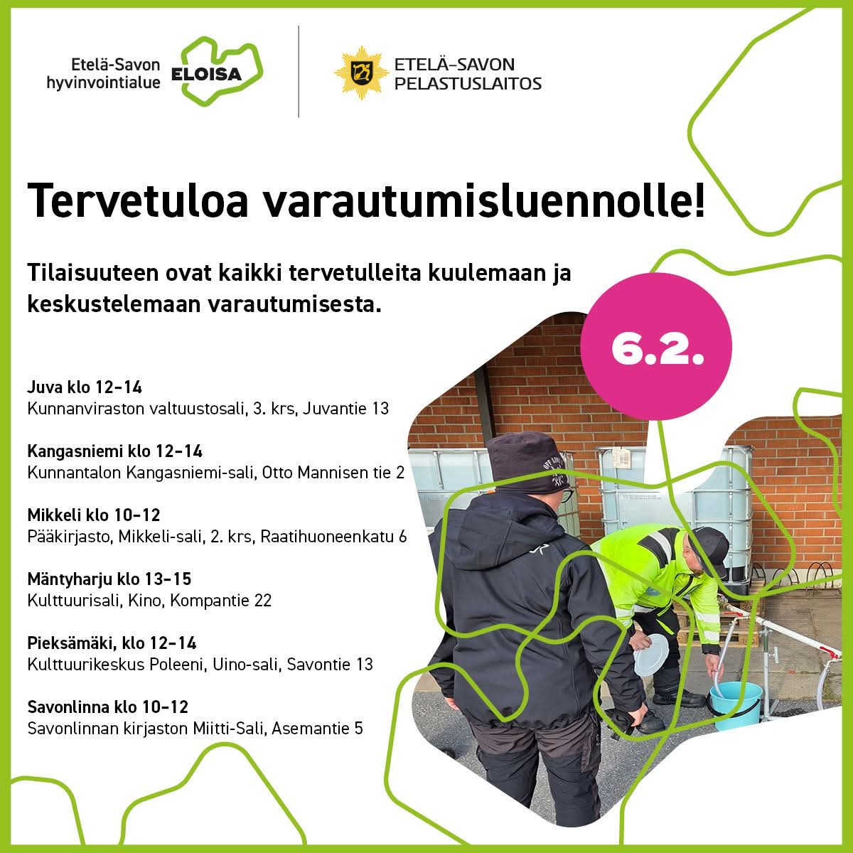 📢 Tämän viikon lauantaina 7.2. vietetään kansallista varautumispäivää. Kuljemme vähän etukenossa, ja järjestämme Etelä-Savon asukkaille suunnatut varautumisinfot yhteistyössä kuntien kanssa jo perjantaina 6.2.