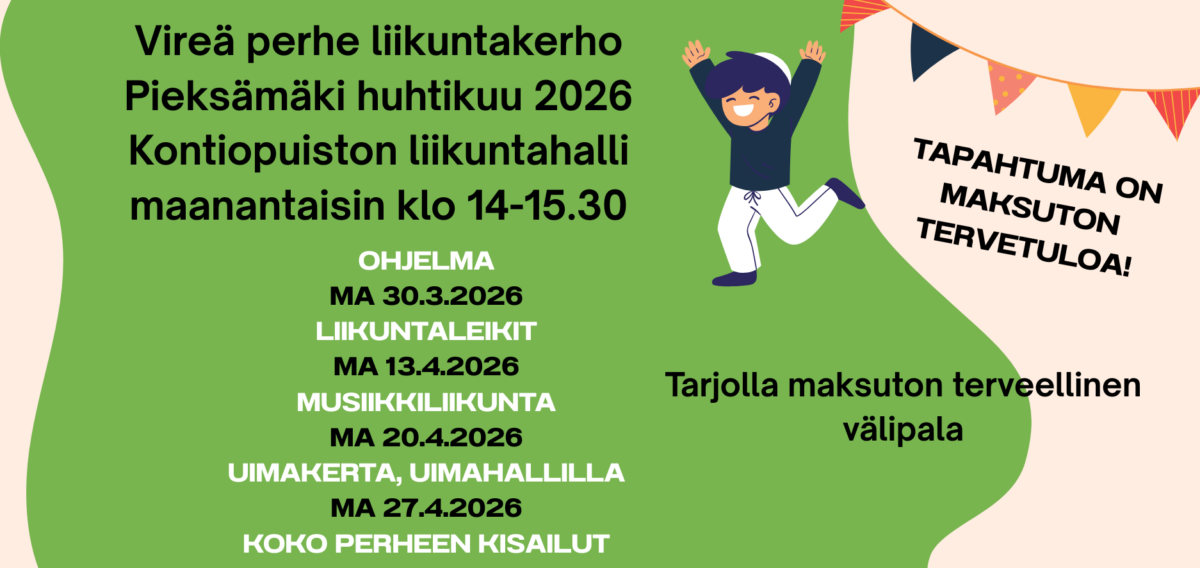 Vireä perhe perheliikunta kerhossa ohjelmassa musiikkiliikuntaa koko perheelle. Maksuton perheliikuntakerho jossa tarjoillaan myös maksuton välipala kerhon yhteydessä. Kohderyhmä kotona- työelämän ulkopuolella olevat ja opiskelemassa olevat perheet ja heidän perheenjäsenet. Kaikki ovat kuitenkin tervetulleita liikkumaan!